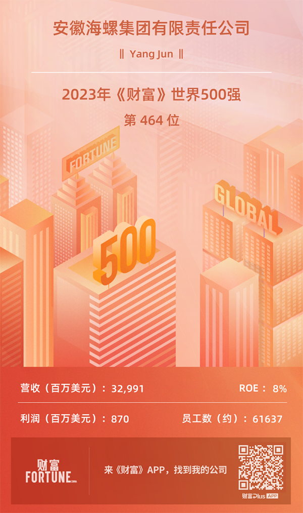 财富Plus APP于北京时间2023年8月2日与全球同步发布了最新的《财富》世界500强排行榜。海螺集团以32,991百万美元的营收名列2023年《财富》世界500强第464位。