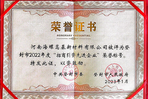 2023年元月29日,河南省登封市召开2023年度产业发展招商引资优化营商环境暨民营经济高质量发展大会,海螺新材旗下河南海螺嵩基新材料有限公司荣获登封市2022年度“招商引资先进企业”荣誉称号。