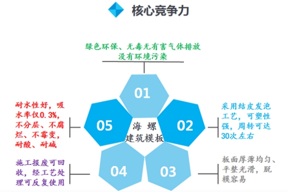 作为替代传统木模板的新型产品,海螺建筑模板生产过程中没有环境污染,无有毒有害气体排放,在施工使用过程中不产生建筑垃圾,可100%回收循环利用,便于现场安全文明施工管理,不仅节约成本,还可为绿色建筑奖项申报加分。