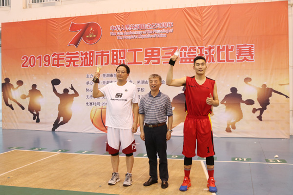 经过一个多小时的激烈角逐,海螺型材代表队奋勇拼搏,稍逊一筹荣获2019年芜湖市职工男子篮球比赛亚军,芜湖市人大委员会副主任、市总工会主席韩卫民为冠亚军颁发了奖杯。