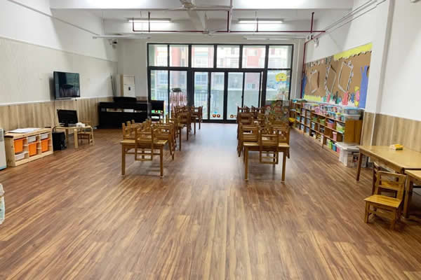 产品表面耐磨层有超强的防滑性能,摩擦系数大于0.5,达到欧美商用地板防滑标准。与普通的地面材料相比,在粘水的情况下脚感更涩,更不容易滑倒,适合在公共区域给孩子们使用。