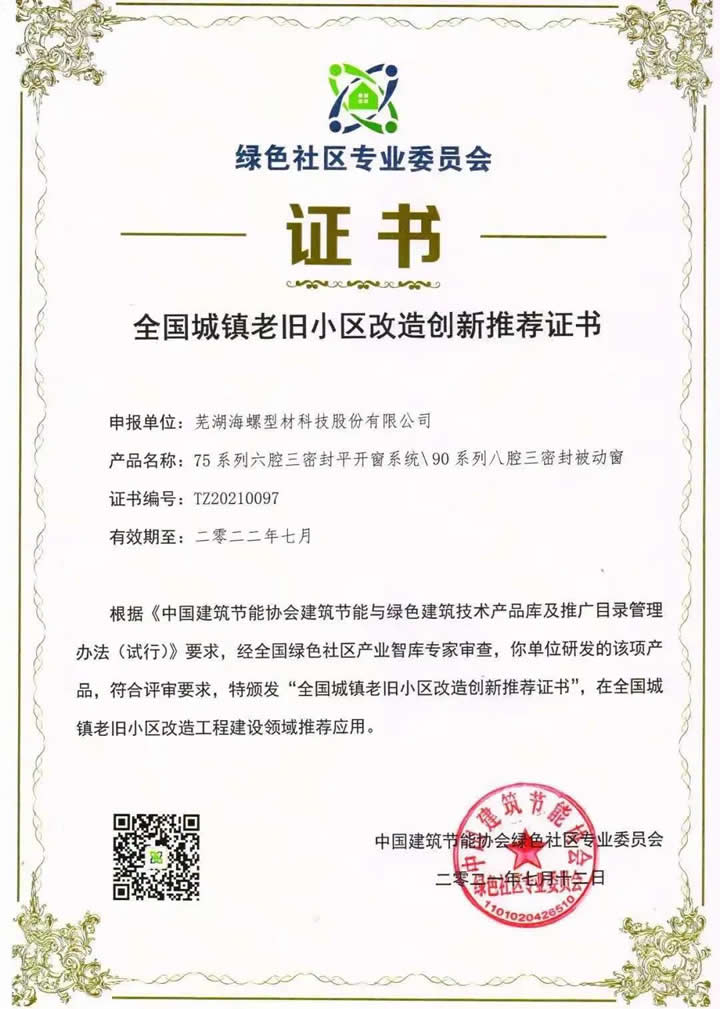海螺型材积极参与地方建筑节能标准制定,同时加大系统门窗技术研发,被动窗产品在获得德国能源署被动门窗研究所颁发的PHI认证证书基础上,近日在国内又获得康居产品认证证书,加入了被动式低能耗建筑产业技术创新战略联盟,入选了被动式低能耗建筑产品选用目录,整窗传热系数K值≤0.80 W/(㎡·K),产品节能效果突出,适用于严寒、寒冷地区被动式超低能耗建筑。
