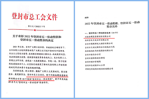 近日,登封市总工会开展2022年度市五一劳动奖状、五一劳动奖章评选,海螺新材旗下河南海螺嵩基新材料有限公司荣获登封市“五一劳动奖状”荣誉称号。