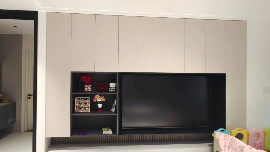 客餐厅通体设计,简约而不简单,电视背景墙集收纳和实用为一体,搭配开放格和悬浮电视柜,既方便了生活又增加了视觉美感。