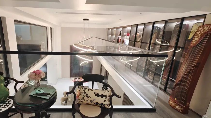 在此处、目光所及皆为海螺系列产品,整墙书柜设计,集收纳、展示、便捷为一体,使空间利用最大化。琴棋书画的休闲区域与海螺生态地板融合也相得益彰。通透的玻璃护栏、考虑采光通风的移门设计,使整个空间视觉延伸拉长,增加了空间感和灵动性。