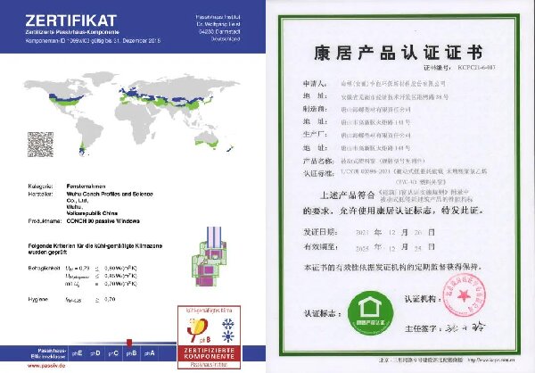 海螺ES90被动式门窗系统先后获得了德国PHI认证证书、康居产品认证证书