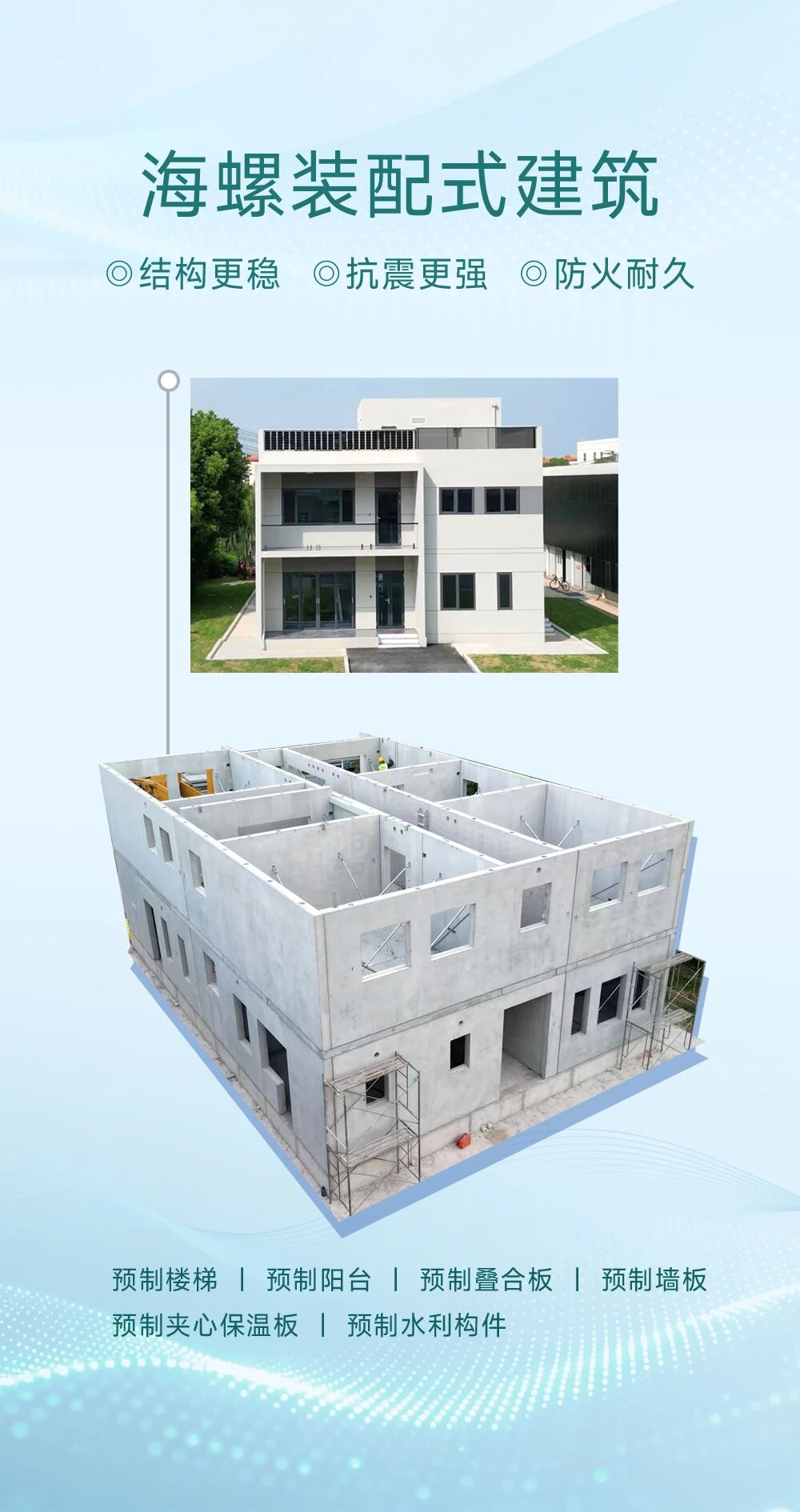 安全是“好房子”的首要标准海螺水泥高强度、高稳定、高耐久以卓越品质筑牢人居根基给你稳稳的安全感海螺装配式建筑品类丰富工厂精密预制、现场精准装配杜绝空鼓、开裂、渗漏等传统通病结构更稳、抗震更强、防火耐久200平米上下2层的房子仅用3天就能完成拼装