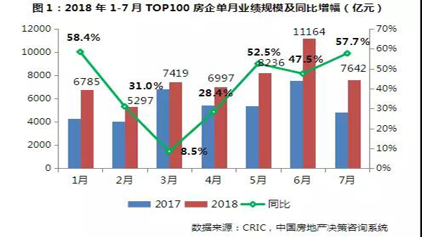 2018年7月,TOP100房企的销售由于季节性因素较6月份有所下滑。与6月单月超万亿的销售规模相比,百强房企7月的业绩环比下降31.5%。但与去年7月业绩陡降的情况不同的是,本月7642亿元的销售与1-6月均值基本持平。今年百强房企7月单月业绩的同比增幅达57.7%。